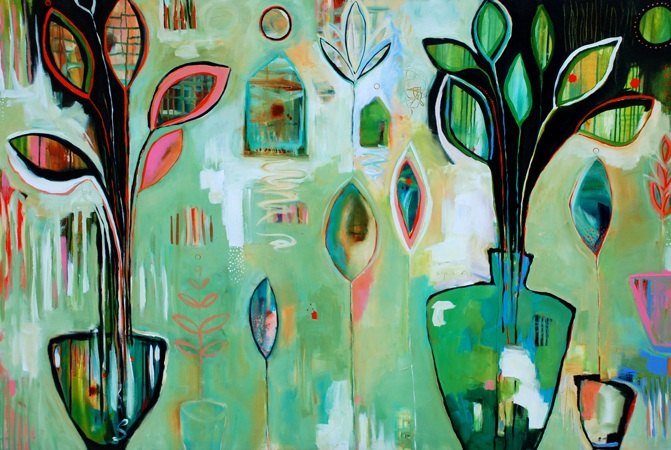 I delayed holiday gratification until February, and enrolled in Flora Bowley's 'Bloom True" online e-course. Because I love her paintings, and her funky groove-chic style. It all starts on Monday, and I have a notion to blog on the progress here. I've cleaned out the studio, restocked the paint table and am ready to go. I haven't looked forward to something like this in a LLoooonngg time. :D